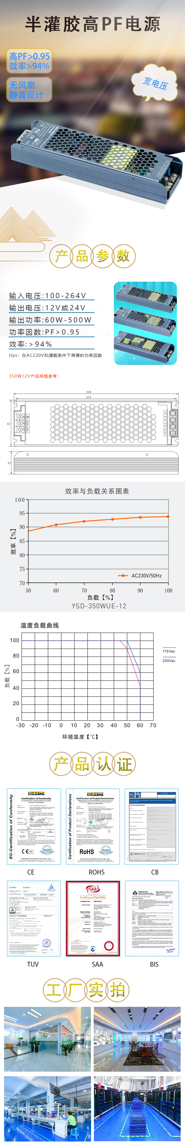 更寬廣的電壓適應(yīng)能力,在電壓波動較大的情況電源仍可穩(wěn)定工作,PF值>0.95 。